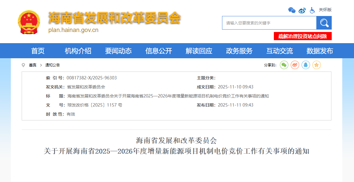 海南省发展和改革委员会关于开展海南省2025—2026年度增量新能源项目机制电价竞价工作有关事项的通知